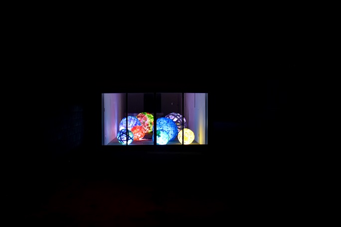 仕事を終えた帰り道、国道56号を新屋駅前通りに曲がると、久々に新屋NINOから漏れる灯りに目が留まります。新型コロナウィルス感染拡大防止のため、秋田公立美術大学の関連施設は3月下旬から利用が停止されています。「何だろう」とのぞき込むと、和紙などで形作られた球体のオブジェが色とりどりの柔らかな光を放っていました。