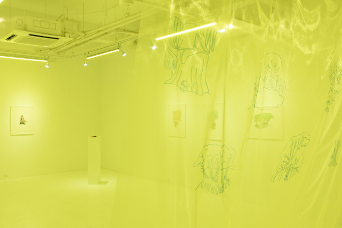 2019年の秋の展覧会で実現されたインスタレーションによる長坂の表現は、単なる視覚的な平面表現でもなければ、社会的なコミュニケーションの中に溶解する脱視覚的表現でもなかった。その展示は少なくとも過去の二百年の間に起こった人間の歴史と非人間の時間を媒介するだけでなく、個人の一生を超えて持続する時間の流れやその間の記憶の蓄積、そこから派生する事物の連鎖や複数種の織りなす生命活動の網目を感じさせる。さらに、長坂の作品は木という植物を描くことで定住と移動、過去と未来、生命と非生命を鏡面のように反転させ、これから起こるかもしれない未知の出来事や、生まれてくるかもしれない生命の予感を映し出している。黄色の光に包まれたこの空間は、まさにこれから上演されるドラマの先触れであったのだ。