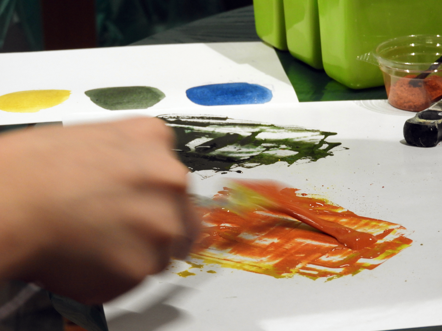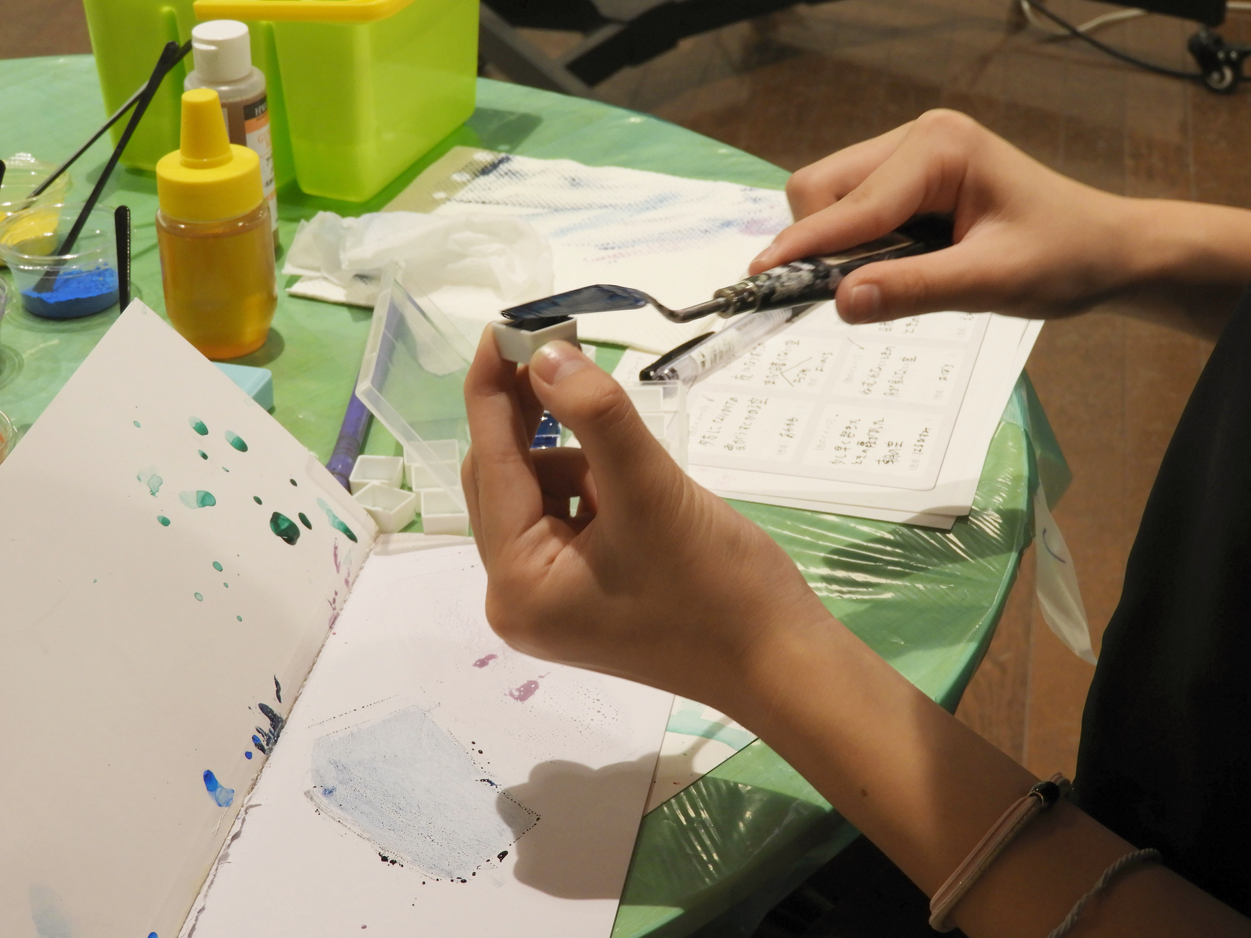 大関先生の実演後、いよいよ参加者が各自のアイデアにしたがってチャレンジしていきます。最初は選んだ顔料とアラビアゴムとハチミツを、慎重に試しながら混ぜ合わせます。ペインティングナイフで質感を確かめながら、時に緩やかに、時に力強く練り上げ、小さな水彩パンに自分で調合した絵の具を注意深く収めていきます。