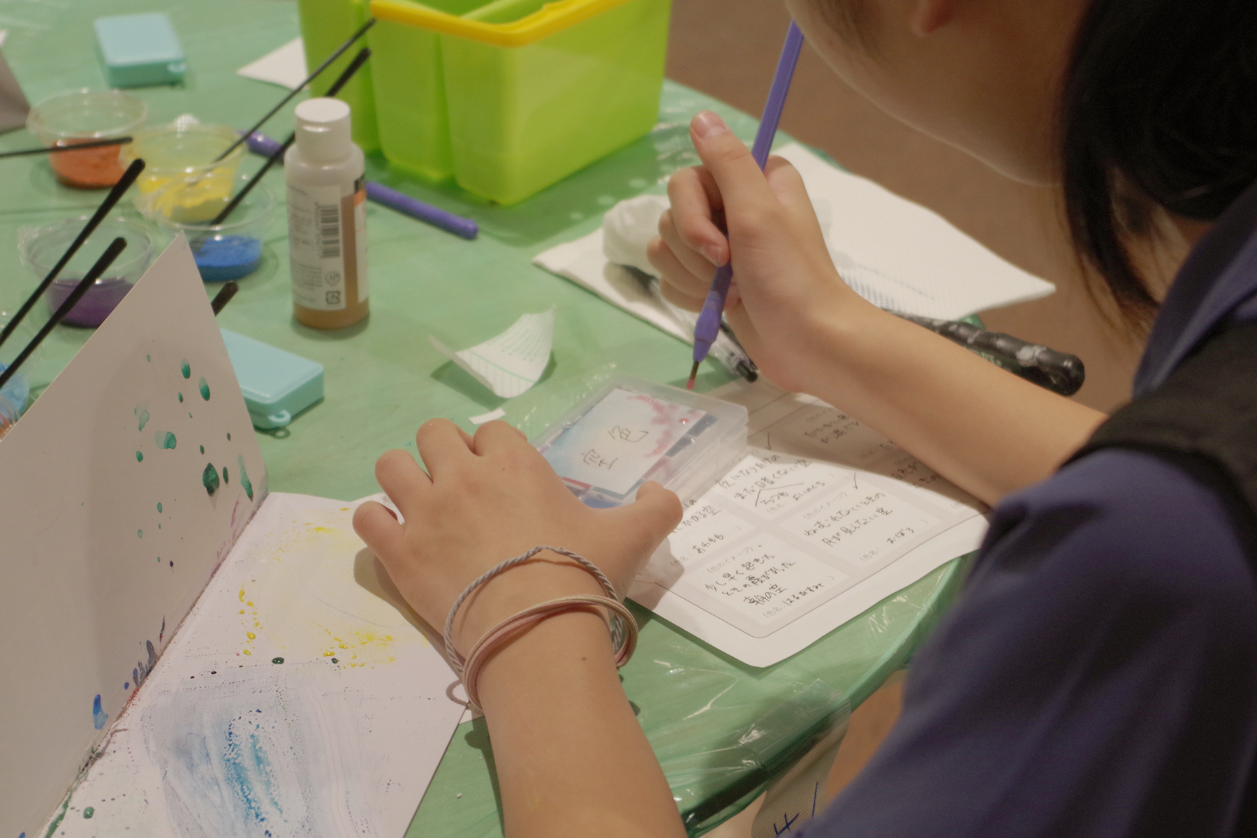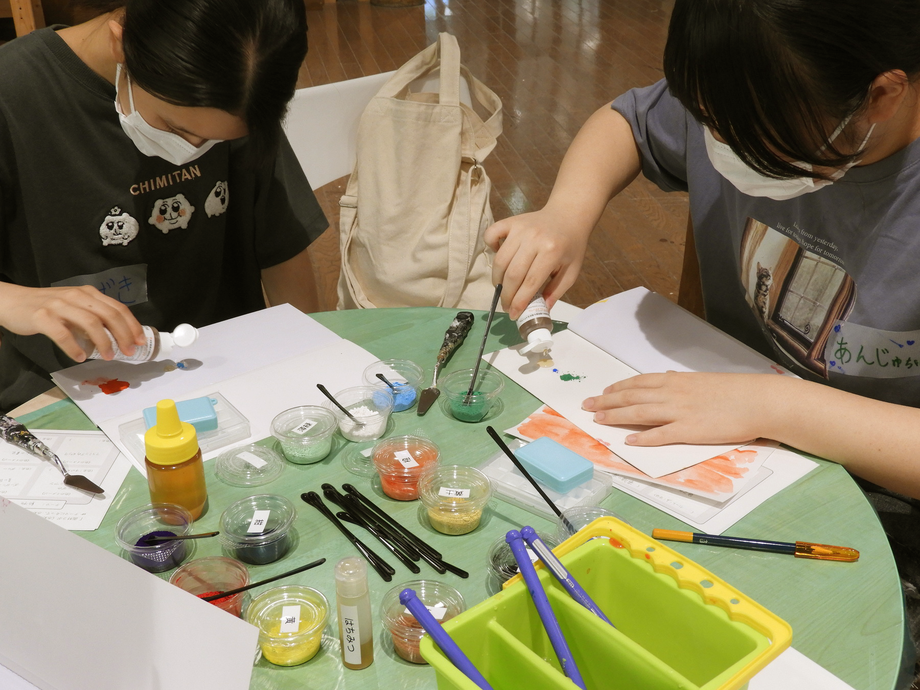 シールラベルにタイトルなどをつけて、ケースに貼っていきます。最後にひとつのテーブルの上に全員のケースを並べて、どんな絵の具を作ったのか、お互いに見せあいました。