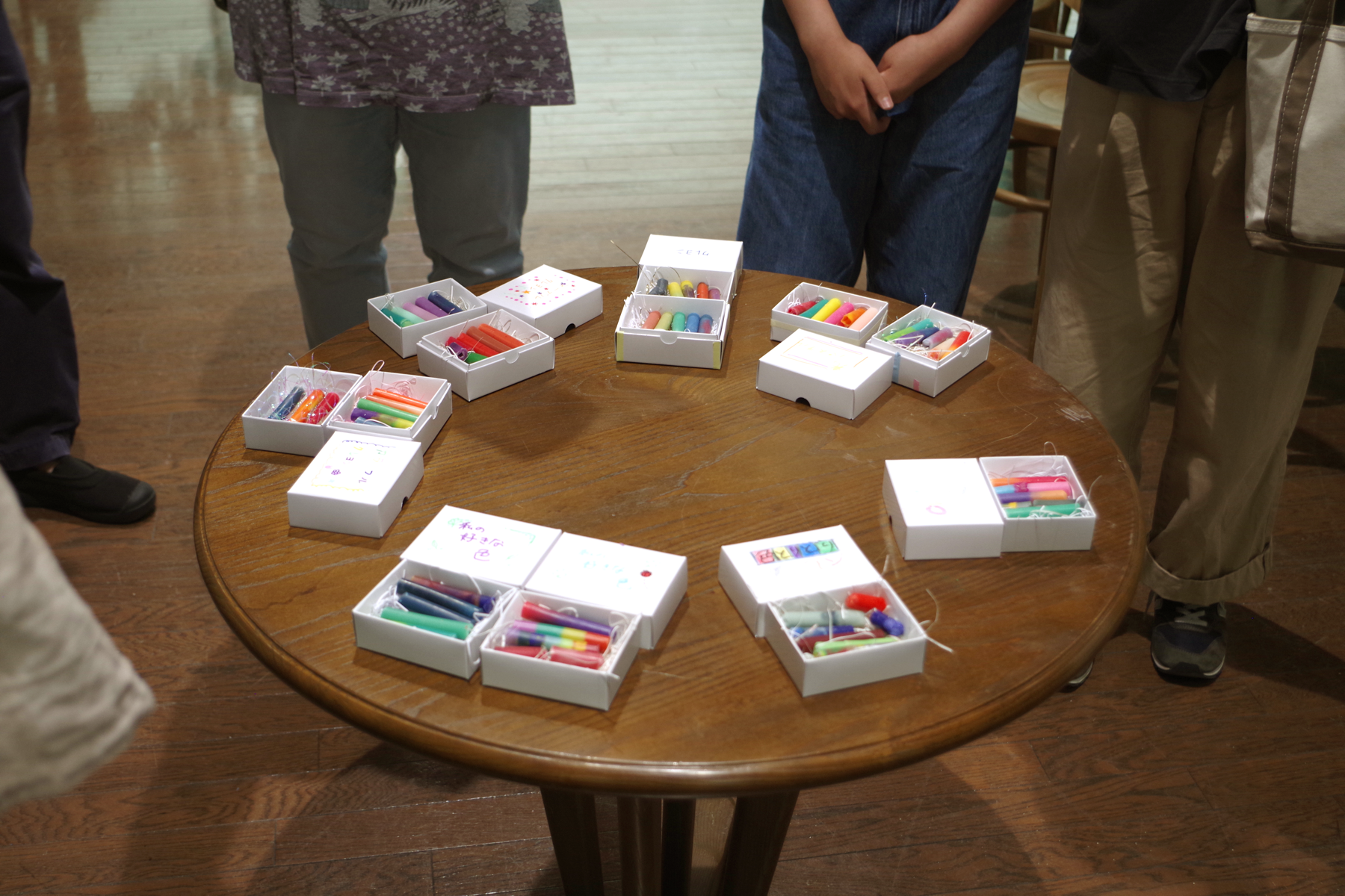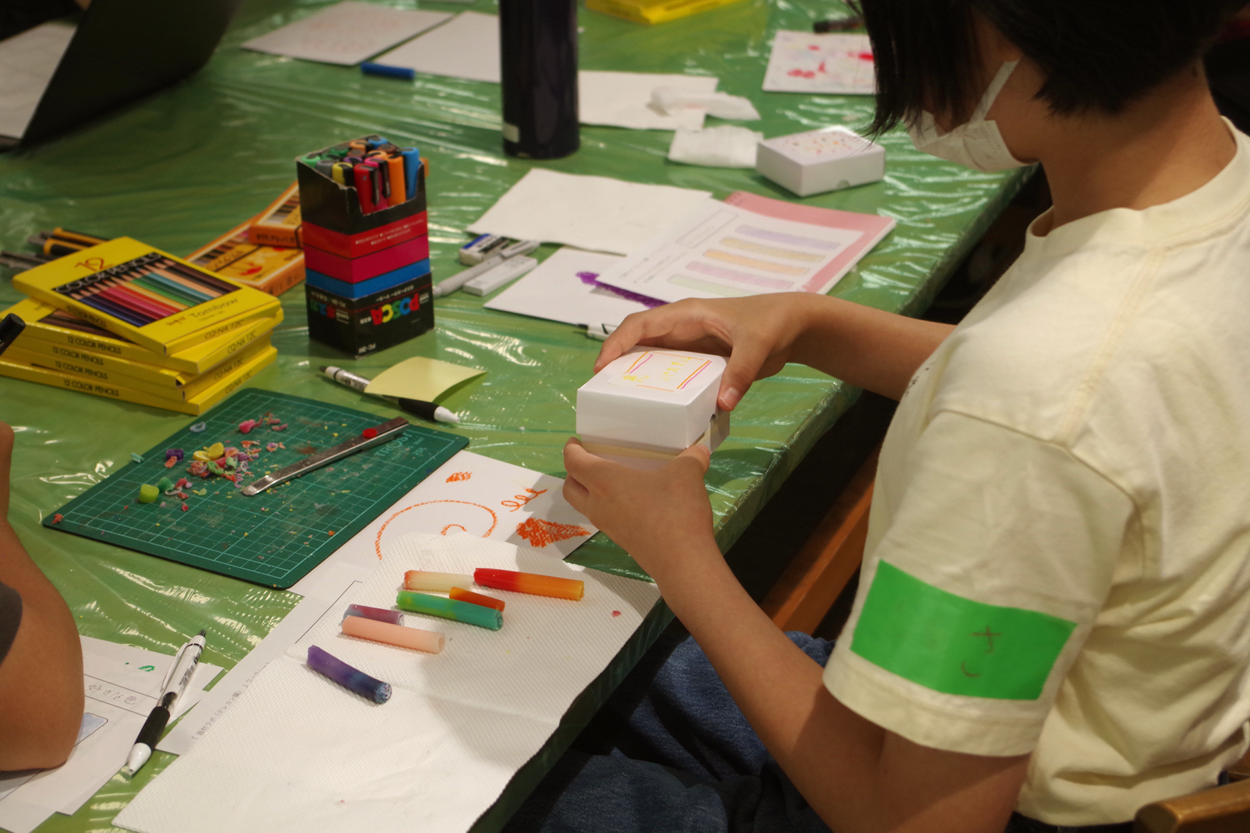 最後に、作ったクレヨンを持ち帰るための白い箱と紙パッキンとラベルを準備し、各自でラッピングをしてもらいました。この世にふたつとないクレヨンの出来上がりです。