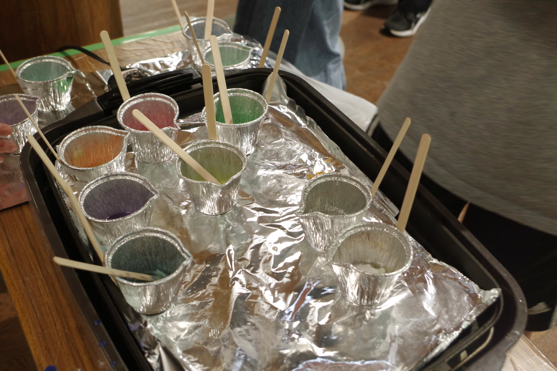 ある参加者は、ホットプレートに並び始めた他の参加者の余った液体原料をみて、それらを再利用することを思いつき、7色のクレヨン作りに挑戦。最初は自分の好きな色のクレヨンを作ろうとしていたのですが、柔軟に計画を変更し、全く違うアプローチを試すことができることも、複数人で取り組むワークショップの魅力的なところです。