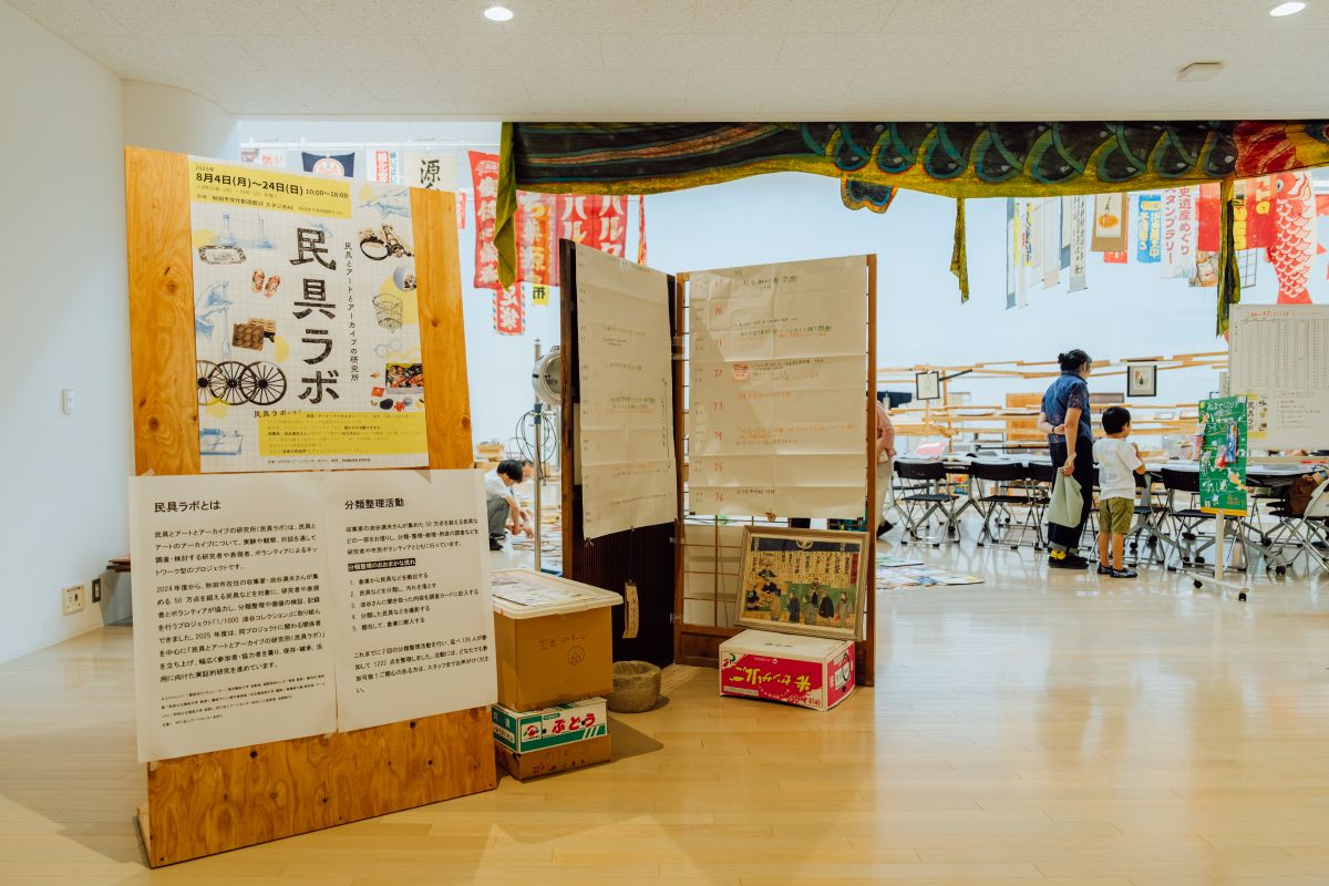 収集家の油谷満夫さんが集めた民具等のコレクションを、研究者・表現者・ボランティアらが協働して分類整理や記録、活用に取り組む活動。民具とアートのアーカイブについて、実験や観察、対話を通して調査・検討する研究者や表現者、ボランティアによるネットワーク型のプロジェクト「民具とアートとアーカイブの研究所(民具ラボ)」の一環として、秋田市文化創造館を主な会場として実施。