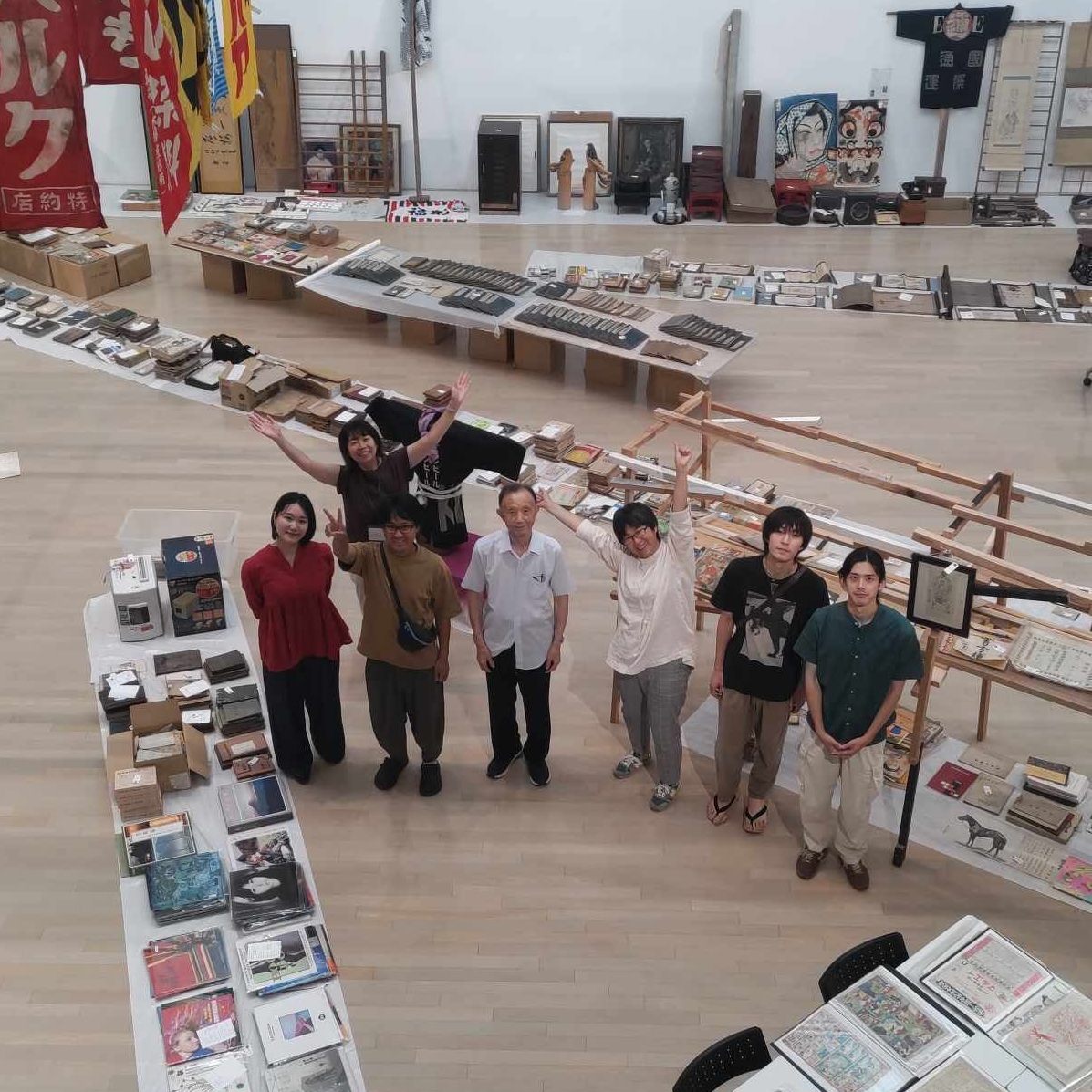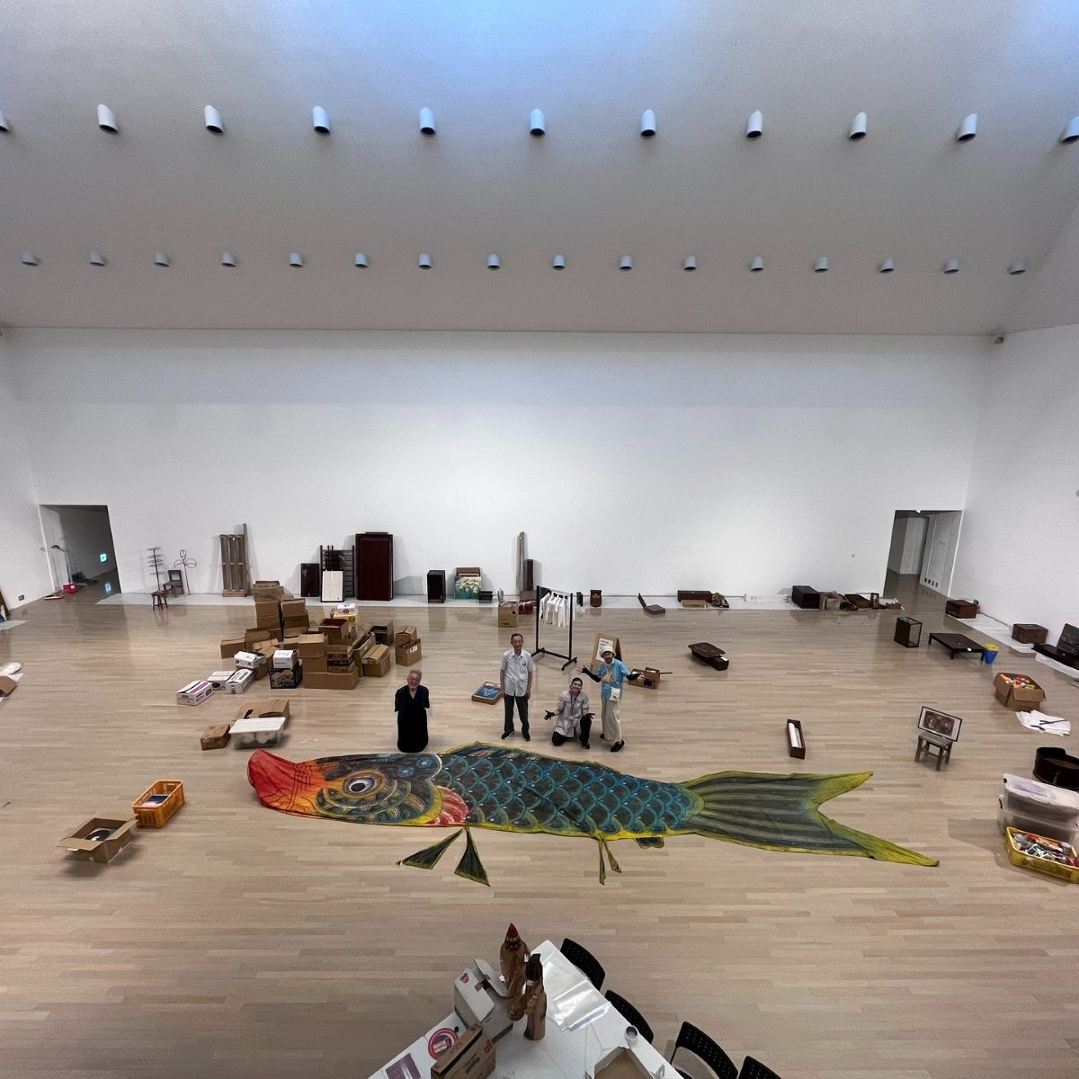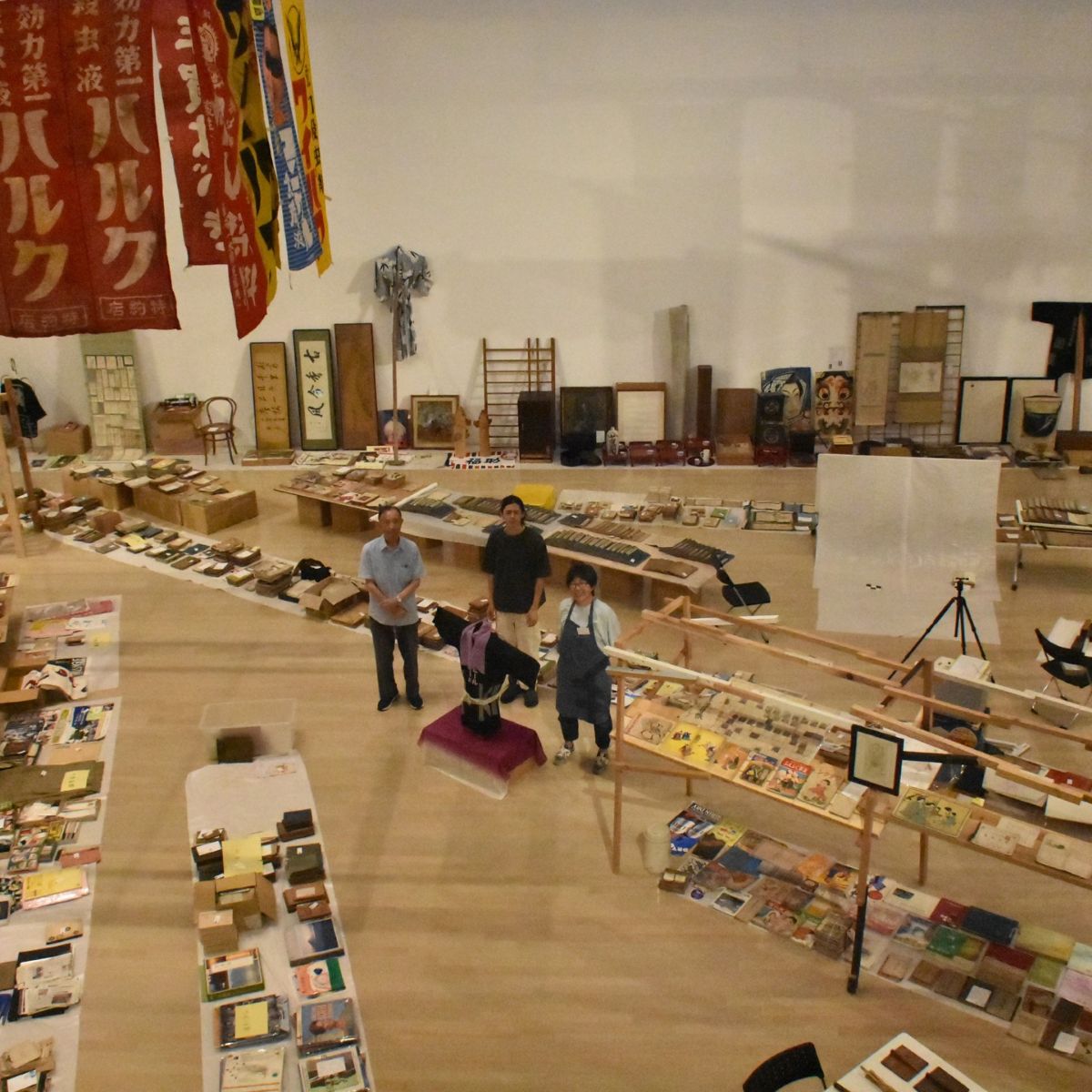 午前中は吊バトンに物を吊るす作業など。巨大な鯉のぼりが見つかったので、それも展示した。東北芸工大の学生さんがボランティアに参加。8月7日にオープンする明徳館ビルでの展示のため、一部の物を持ち出し。展示作業中、ビルに勤務する警備員さん、通りすがりの人が興味深そうに見ていた(声をかけてくださった人も)。
