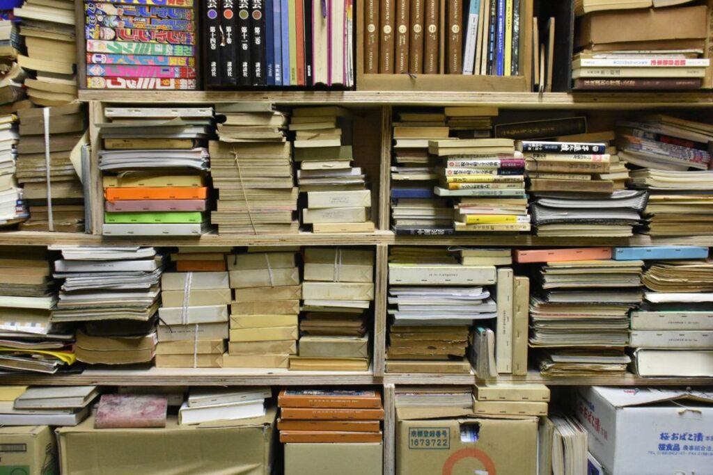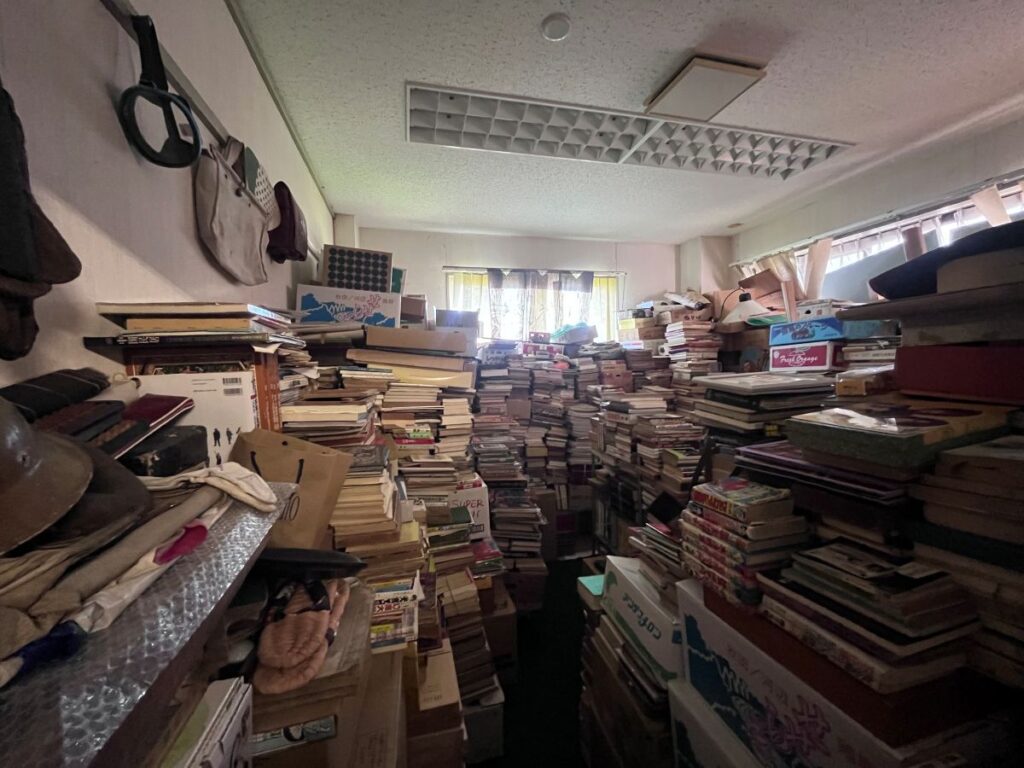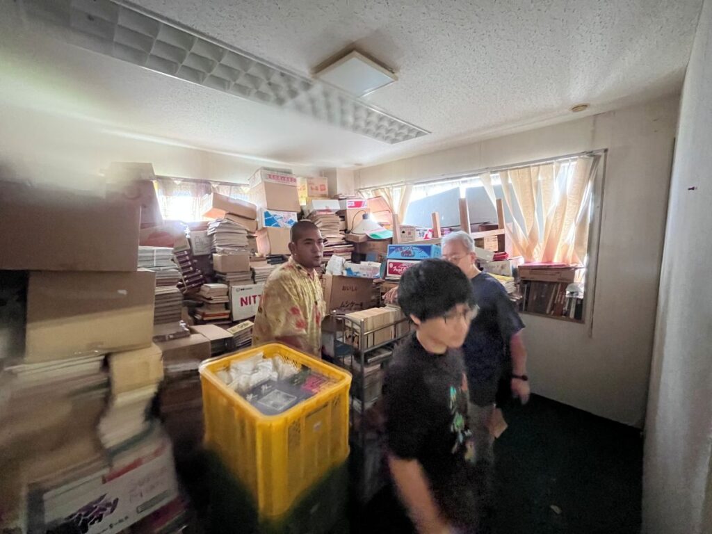 三富と藤ほか2人は、男鹿市内の油谷さんの倉庫に赴き、秋田市文化創造館で分類整理した物を収納する場所を確保するための作業に着手。本で埋まった空間に、棚を簡易的につくってスペースをつくり、そこに物を納めるのが三富案でしたが、現地を見た藤さんが一言「これは、無理だよ」。