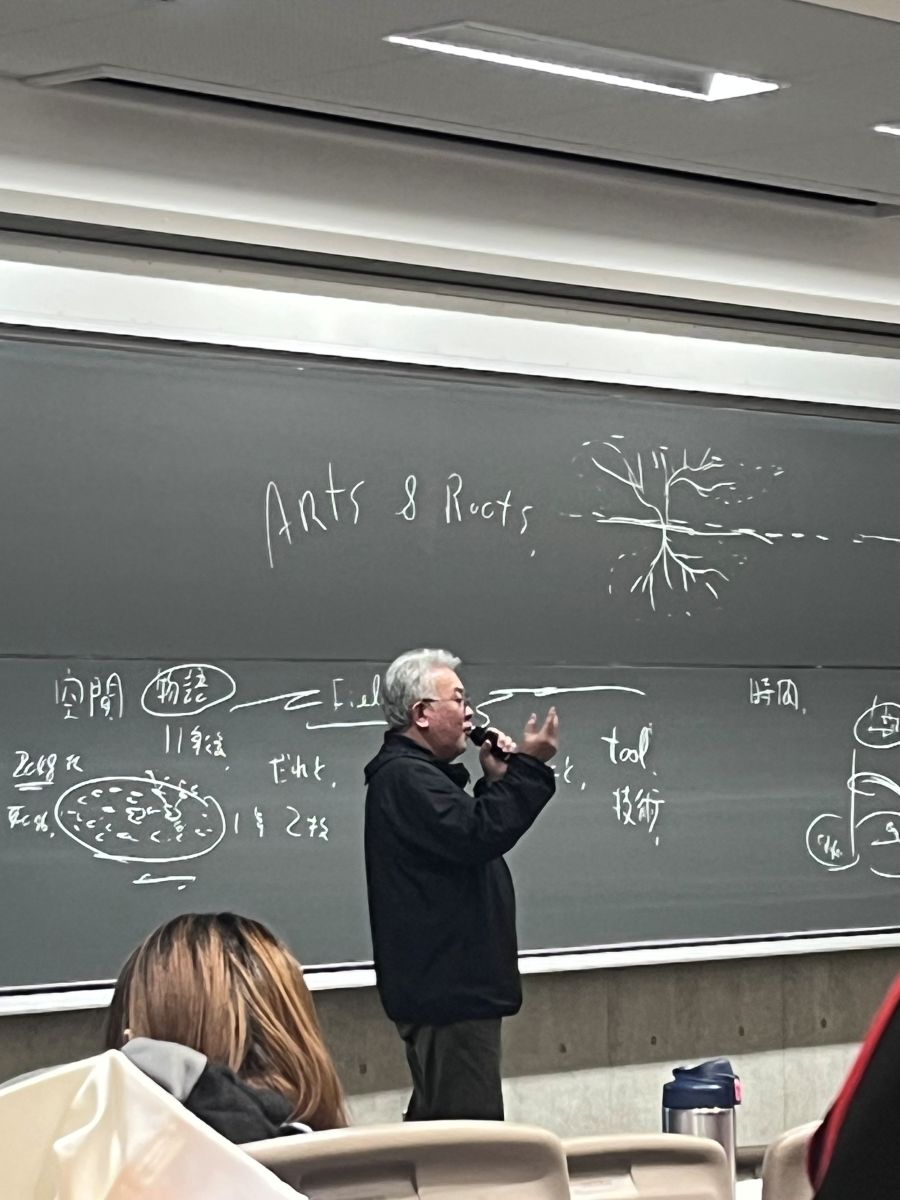 板書に「ARTS&ROOTS」という文字とその横にイメージを書いているけど、結局説明せずに終わっちゃったね。ルーツを示す、遺伝子と生態系の根っこの2つのイメージ。下のルーツは隠れていて見えないんだけれど、辿ることで可視化することができる。上に広がる未来のルーツは予想できないみたいな話を、以前授業の中でやっていたんですよね。それから時間の捉え方や空間の捉え方とか、つくるモチベーションだとか、特質がどこから来るか、表現は何に繋がるのかみたいな、そういう話をずっとしてきた。お蔭様で楽しく授業させていただきました。